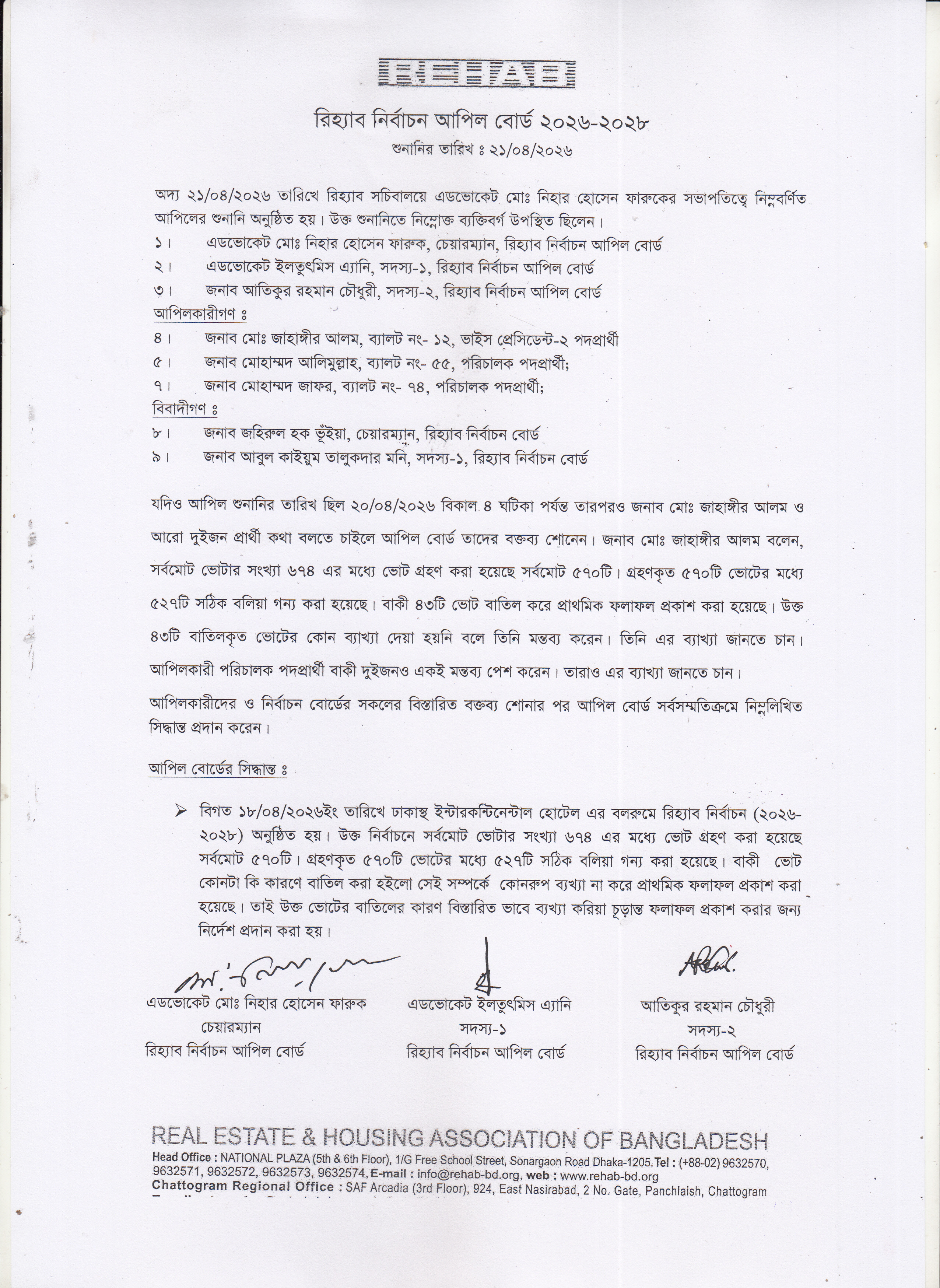 রিহ্যাব পরিচালনা পর্ষদের মেয়াদ বৃদ্ধি ও রিহ্যাব নির্বাচন এর শুনানীর রায়।